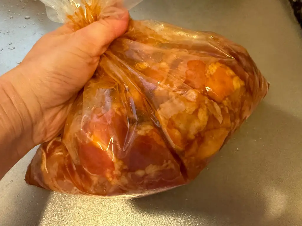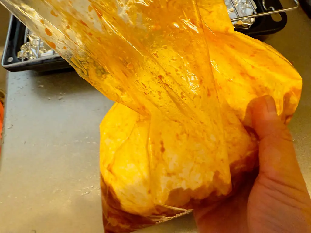 鶏もも肉を一口大にカットし、タバスコ・めんつゆ・にんにくすりおろしと一緒に袋に入れてよくもみます。もうこの時点で危険な香り(物理)がしますが、気にしなくてかまいません。片栗粉と米粉(または小麦粉)をまぶします。