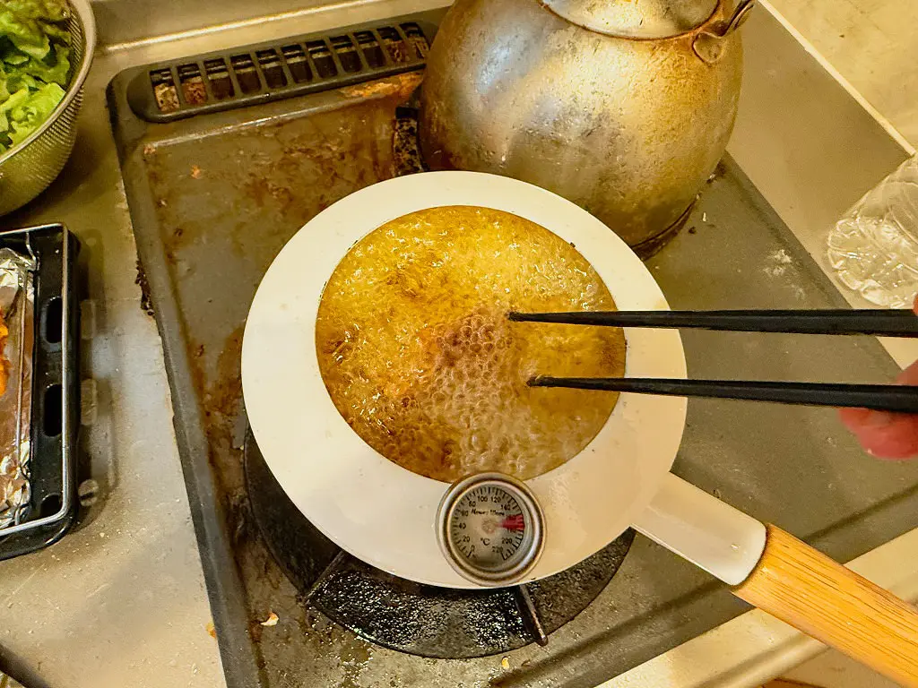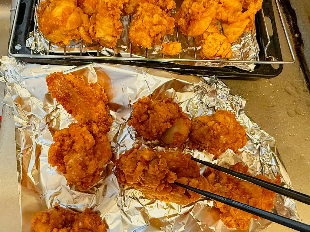 油を170度に熱し、1分半揚げたら4分ほど一旦休ませます。仕上げに180度で1分揚げると、外はカリッと中はジューシーな唐揚げのできあがり!
