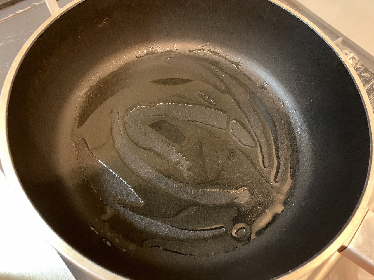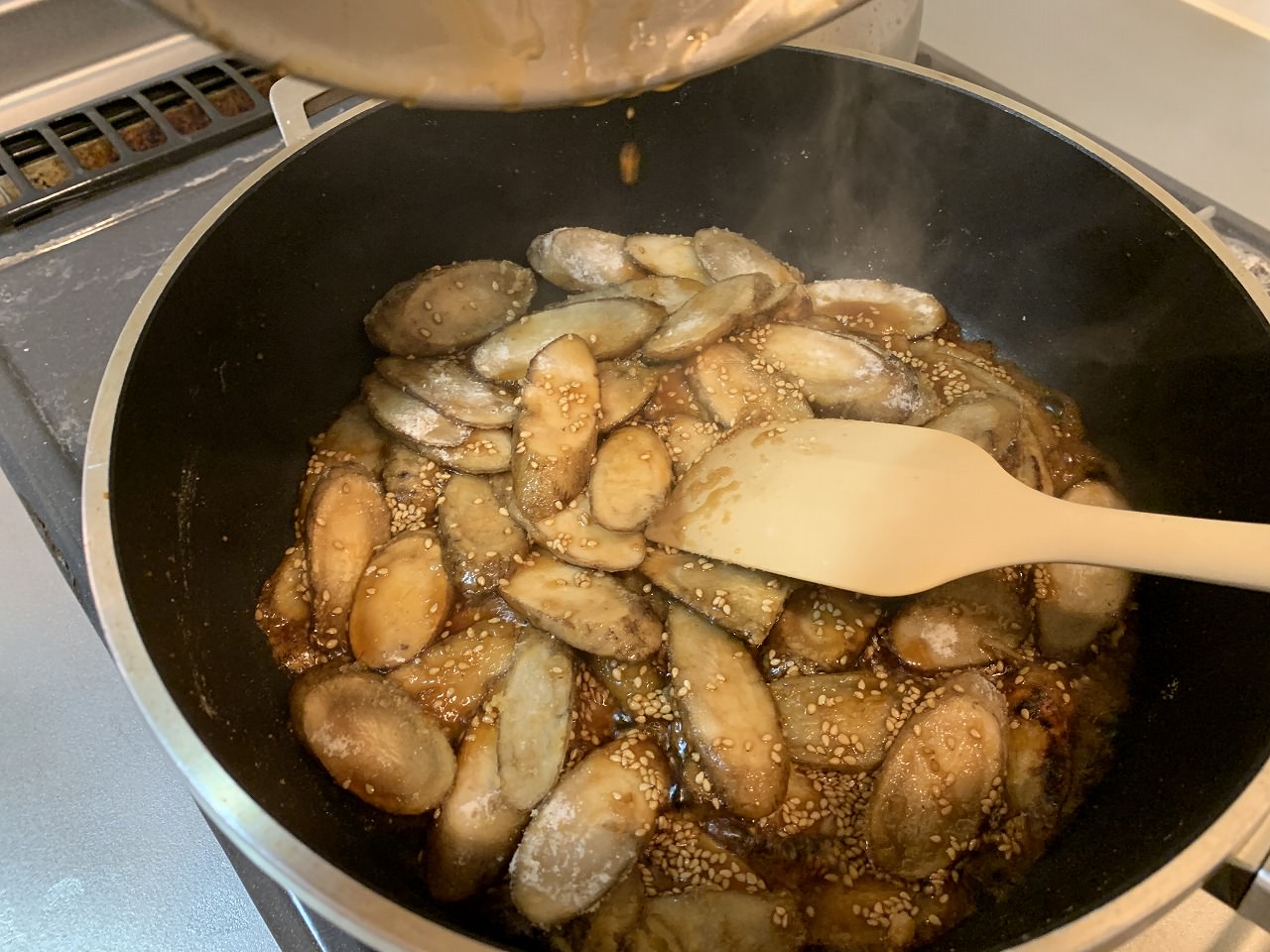 火加減は弱めの中火のままで構いません。ここまでの手順でフライパンが充分に温まっていますので、すぐに調味料がタレ状になります。