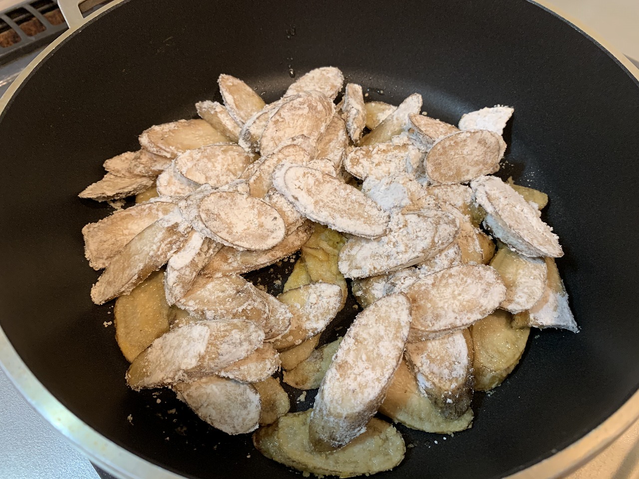 斜め切りにしたごぼうに片栗粉をまぶしてゆっくりと炒め、最後に調味料を絡めて出来上がりです。