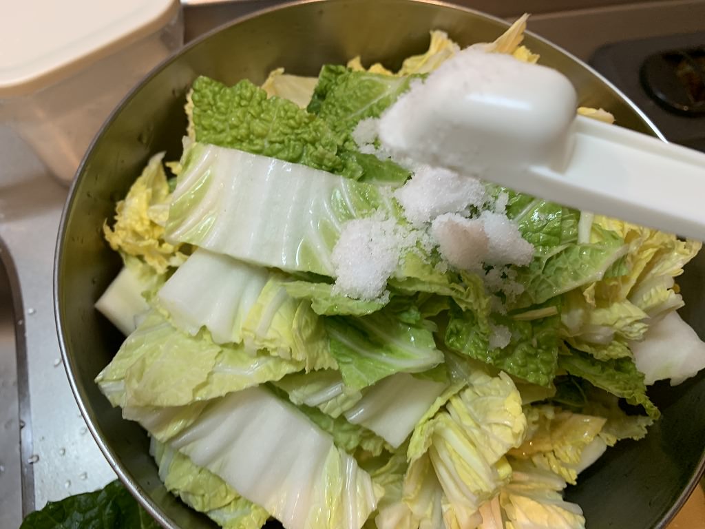 切った白菜の半量ほどをボウルに入れ、塩の分量の半量(4人分の場合は大さじ1)を加え、白菜と混ぜ合わせて全体になじませます。