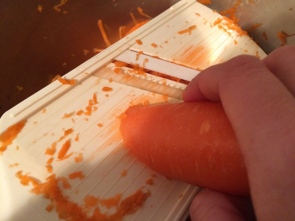 2千切り用スライサーなどで、皮ごと千切りにしてボウルに入れます。