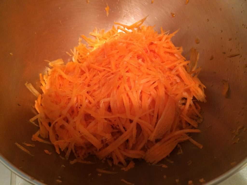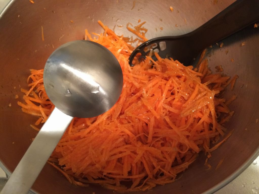 半調理として、千切りにした状態で保存容器に入れ、冷蔵庫で一晩ほど置いてから次の手順を進めると、にんじんの余分な水分が抜け、より味が馴染みます。