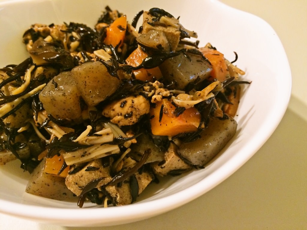 戻したひじきと、刻んだ高野豆腐と根菜類を、調味料でガーッと炒り煮にして出来上がりです。