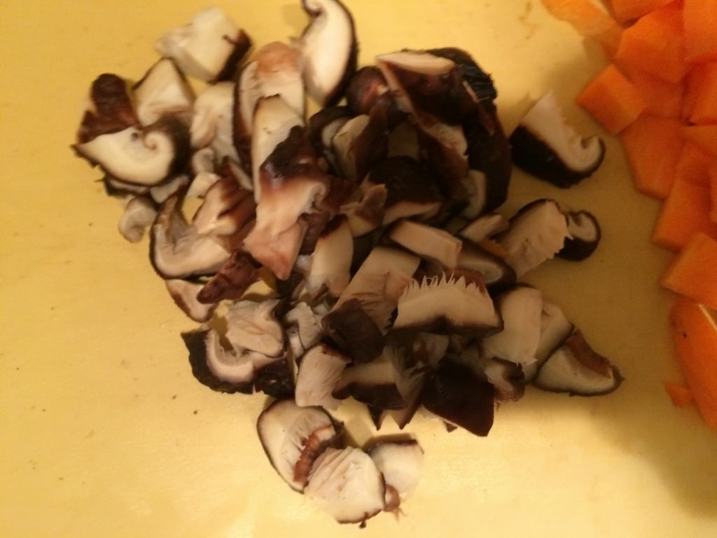 時間がない場合や、思い立って作る場合は、耐熱容器に干し椎茸と、干し椎茸がかぶる程度の水とひとつまみ(小さじ1/6~1/8目安)の砂糖を入れてラップをし、電子レンジ600Wで1分ほど様子をみながら50度程度の温度まで加熱し、冷めるまで置いておくと戻ります。その間に、次以降の手順に進むと良いです。