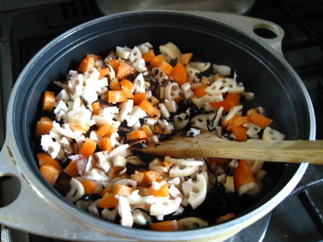 手順9は、先に根菜などを加えて、ある程度火が回ってから、ひじきを加えると良いでしょう。