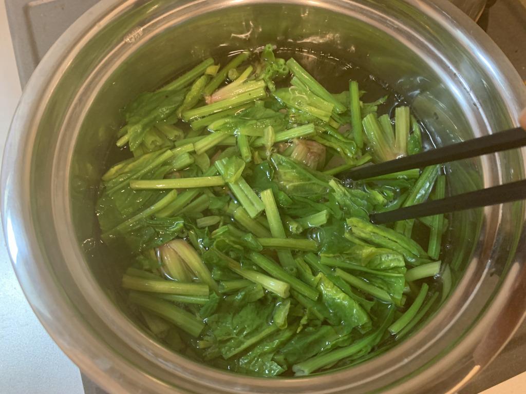 4沸騰したお湯に茎の部分から入れ、すぐにお湯がふつふつとなりますので葉の部分を入れ、菜箸などで全部をお湯につけます。