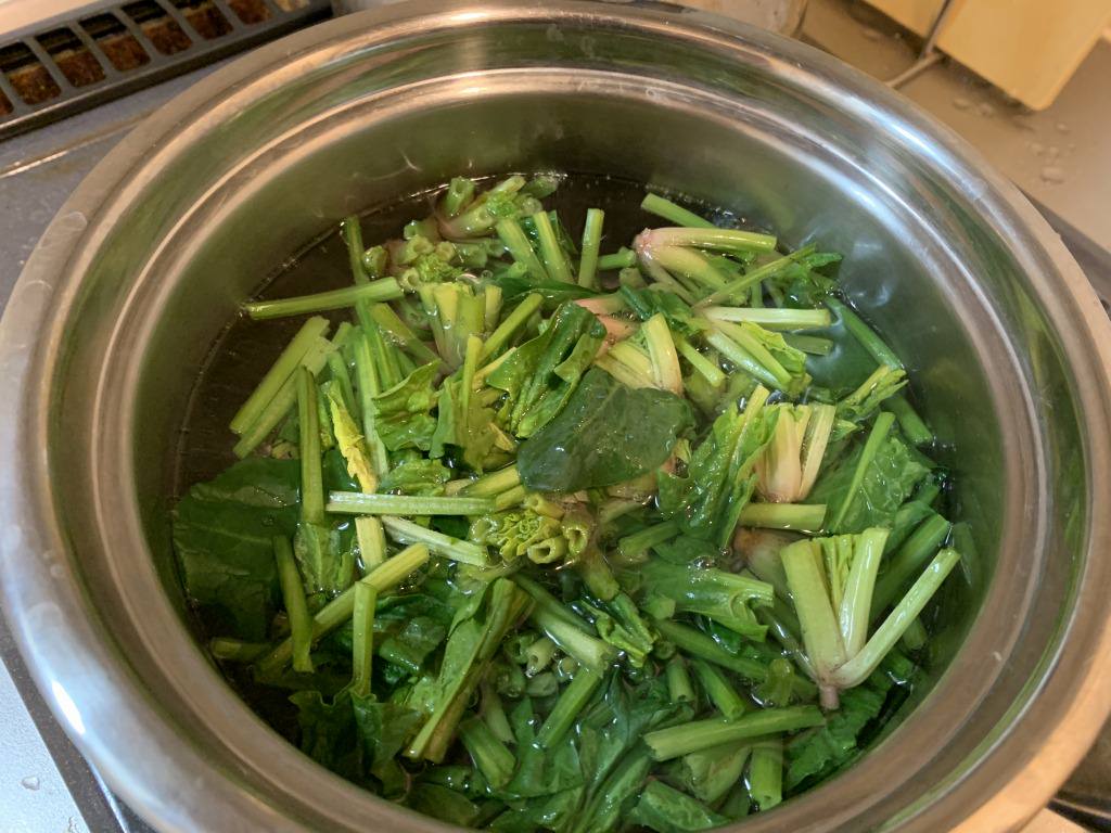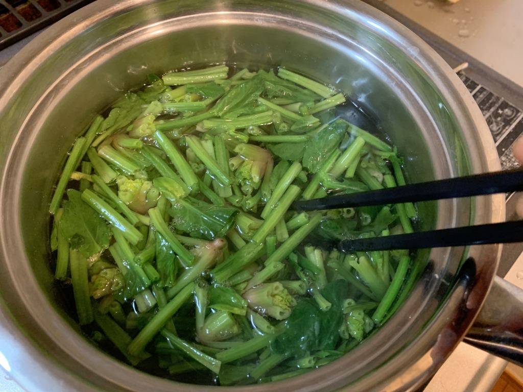 4沸騰したお湯に茎の部分から入れ、すぐにお湯がふつふつとなりますので葉の部分を入れ、菜箸などで全部をお湯につけます。